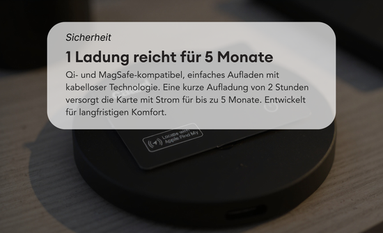 Ja, die Caard Tracking Card verfügt über eine kabellose Ladefunktion für Ihren Komfort. Legen Sie sie einfach auf ein kompatibles Ladepad, um sie bei Bedarf aufzuladen. Eine vollständige Ladung hält bis zu 5 Monate, was durch eine farbwechselnde LED-Leuchte angezeigt wird. Mehrfach wiederverwendbar, wirtschaftlicher.